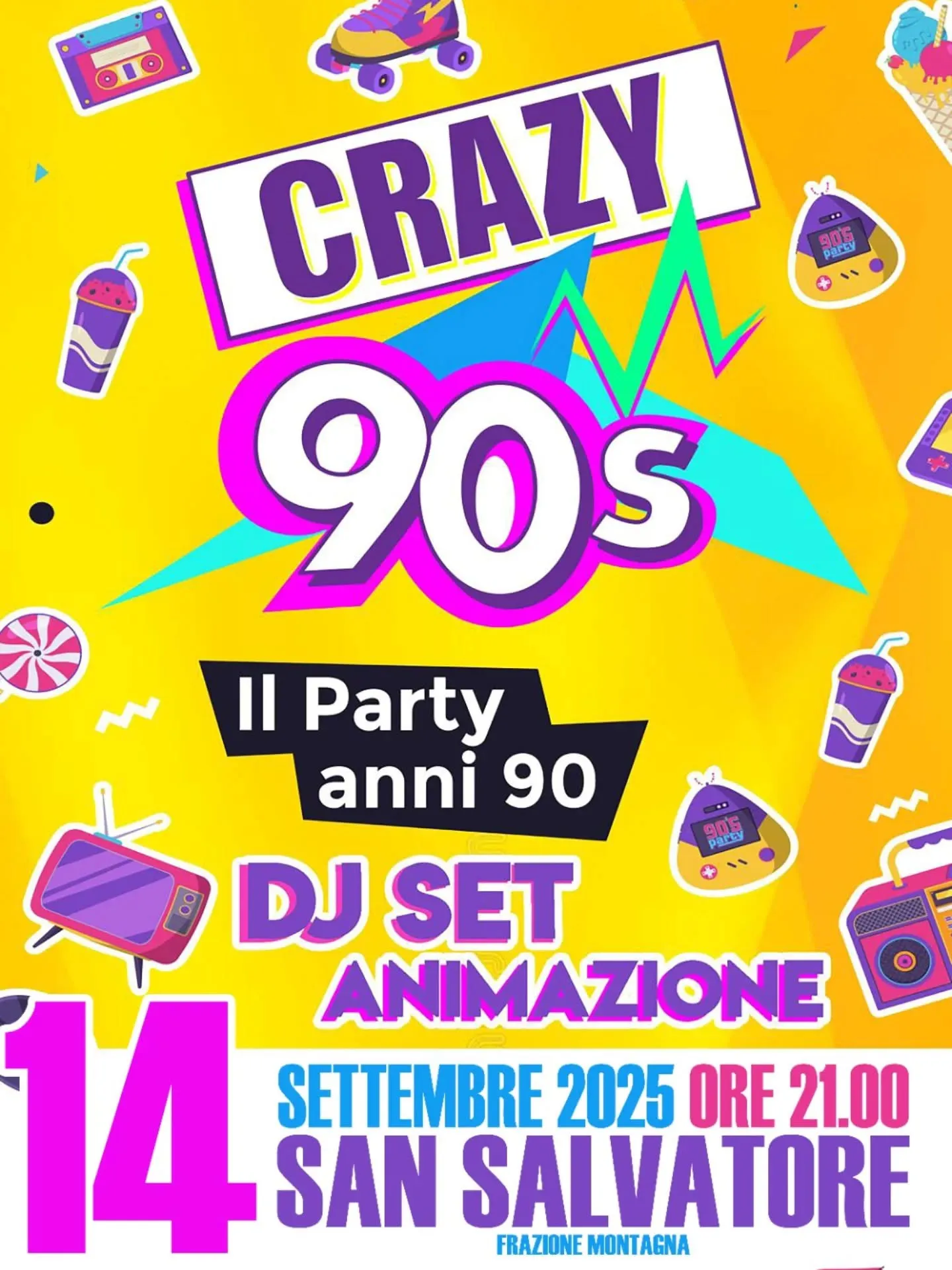 San Salvatore si prepara a vivere una serata all’insegna del divertimento e della musica con il Crazy 90’s Party, il Party 90 più pazzo che ci sia! L’appuntamento è per questa sera, a partire dalle ore 21:00. Il DJ set animerà la piazza e farà ballare tutti con i grandi successi di quel decennio indimenticabile. Alle 23:30 lo spettacolo pirotecnico, curato da Pyrofantasy fireworks, chiuderà in bellezza i festeggiamenti della 54esima edizione della festa patronale, organizzata dall’associazione Vento Nuovo.
