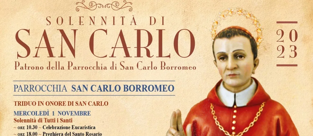 Ore 19.00 PROCESSIONE con la statua di San Carlo Borromeo per le vie del nostro quartiere, secondo il seguente itinerario: Parrocchia San Carlo − Via G. Di Vittorio − Piazzale Bernini − Viale Michelangelo − Via Beato Angelico– Piazzale Penati – Via Caravaggio − Via G. di Vittorio − Sagrato Parrocchia San Carlo.