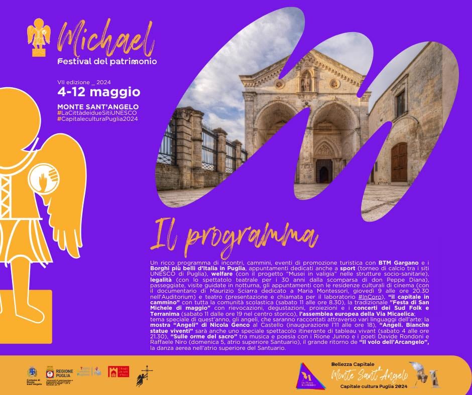 Un festival culturale che celebra la figura dell’Arcangelo Michele nel mondo e che omaggia il patrimonio culturale, spirituale, naturale e gastronomico di Monte Sant’Angelo, la città dei due siti UNESCO. Nell’anno della Capitale della cultura di Puglia 2024, ritorna, dal 4 al 12 maggio, “Michael”, il Festival del patrimonio che celebra l’8 maggio, il Dies Festus delle apparizioni sul Gargano. Per la sua settima edizione, “Michael”, consolida il suo profilo internazionale e si candida a diventare uno dei momenti più attesi e importanti legati al culto e alla storica micaelica.