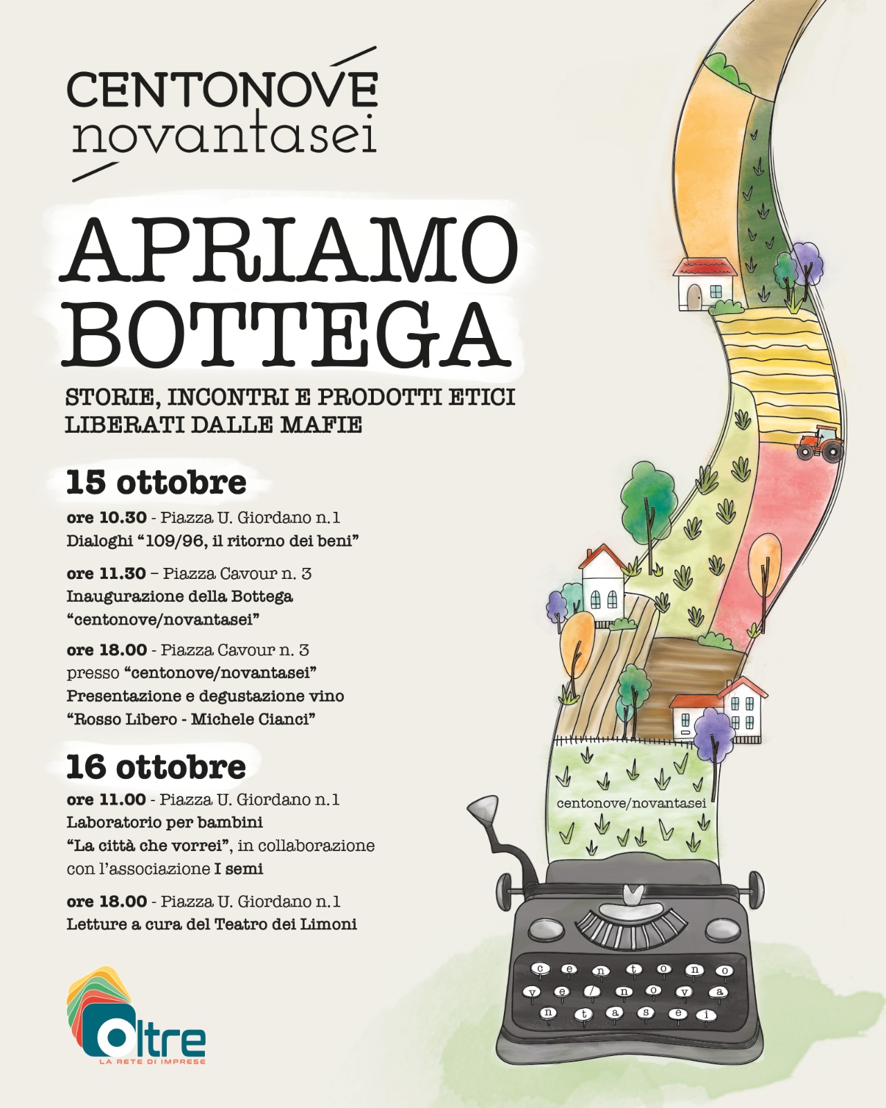 “centonove/novantasei” vuole raccontare tutto questo. E vuole farlo attraverso la varietà dei prodotti presenti sugli scaffali e con un programma di eventi che mira a far conoscere testimonianze, buone prassi, economie sostenibili e circolari, per avviare un processo di riflessione e di contaminazione positiva nelle nostre comunità. Fare cultura, insomma, attraverso il racconto diretto di chi è riuscito a trasformare un luogo simbolo del potere criminale in avamposto di legalità, di sviluppo, di lavoro regolare, di antimafia sociale. Anche per questo, Oltre ha già avviato in queste settimane un percorso di rete con numerose associazioni e realtà del territorio, al fine di allargare la partecipazione ed arricchire le attività di promozione sui temi della giustizia sociale.,