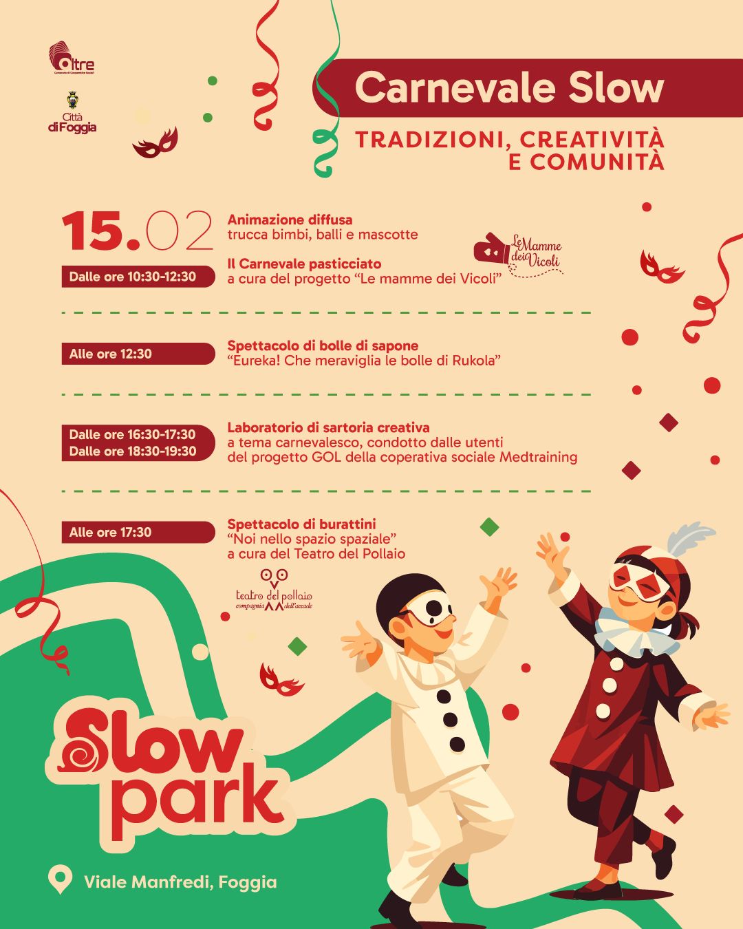 Carnevale allo “Slow Park” di Foggia tra “Tradizioni, creatività e comunità”. Una giornata da vivere all’insegna di laboratori esperienziali, pratiche artistiche e spettacoli dal vivo organizzati dal consorzio di cooperative sociali Oltre che gestiscela struttura di proprietà comunale in viale Manfredi, in adiacenza al Nodo Intermodale della stazione di Foggia. “Carnevale Slow” è in programma domenica 15 febbraio 2026 dalle ore 10.30 alle ore 13.30 e dalle ore 17.00 fino alle ore 19.30, con momenti dedicati a piccoli e grandi che potranno vivere la magia di questo periodo di festa nello spazio il cui logo è ispirato alla chiocciola, simbolo per eccellenza di vita lenta e tranquillità, con l’idea di invitare la comunità a riappropriarsi del proprio tempo per vivere relazioni sociali, conoscere meglio sé stessi, riscoprire prodotti a km 0.