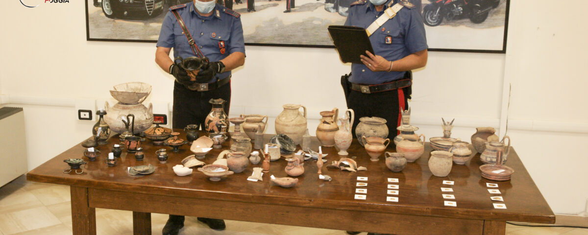 Alcuni giorni fa, i Carabinieri della Sezione Operativa della Compagnia di Foggia, coadiuvati dalle “gazzelle” del 112, nell’ambito delle attività finalizzate al controllo del territorio, hanno effettuato una perquisizione domiciliare in un immobile ubicato nel quartiere “Ferrovia” dove sono stati rinvenuti 54 reperti archeologici risalenti presumibilmente al periodo tra il VI e III secolo a.c. del valore complessivo di circa 15000 euro consistenti in olle, brocche e piccoli vasi in terracotta oltre a 15 monete e una medaglia d’oro risalenti al periodo tra il IV secolo a.c. e il XX secolo per un valore complessivo che oscilla tra i 5000 e gli 8000 euro.