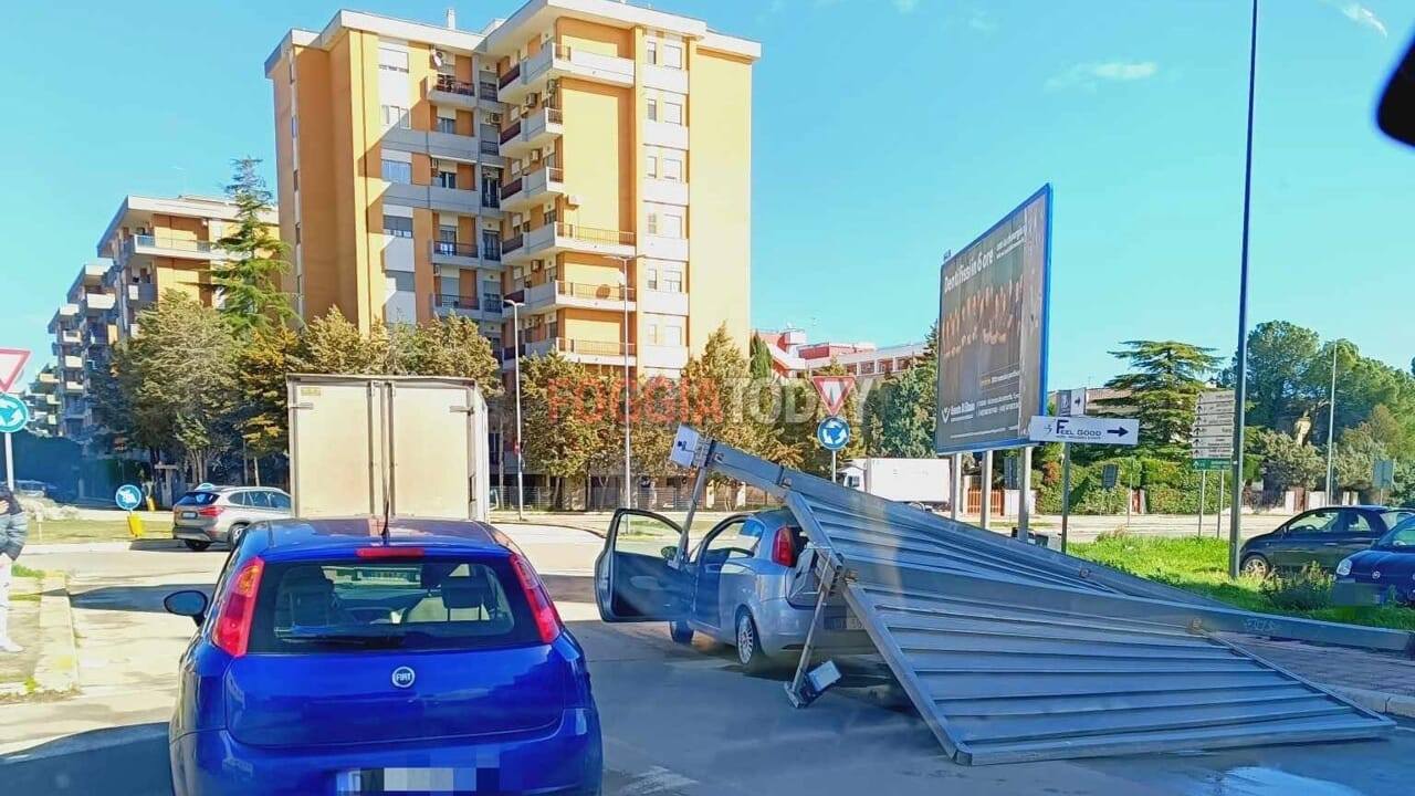 Questa mattina in Via Tratturo Camporeale a Foggia, all’altezza dell’intersezione con Via Paolo Telesforo, un cartellone pubblicitario a causa del vento si è adagiato al suolo colpendo un’autovettura che in quel momento stava transitando.