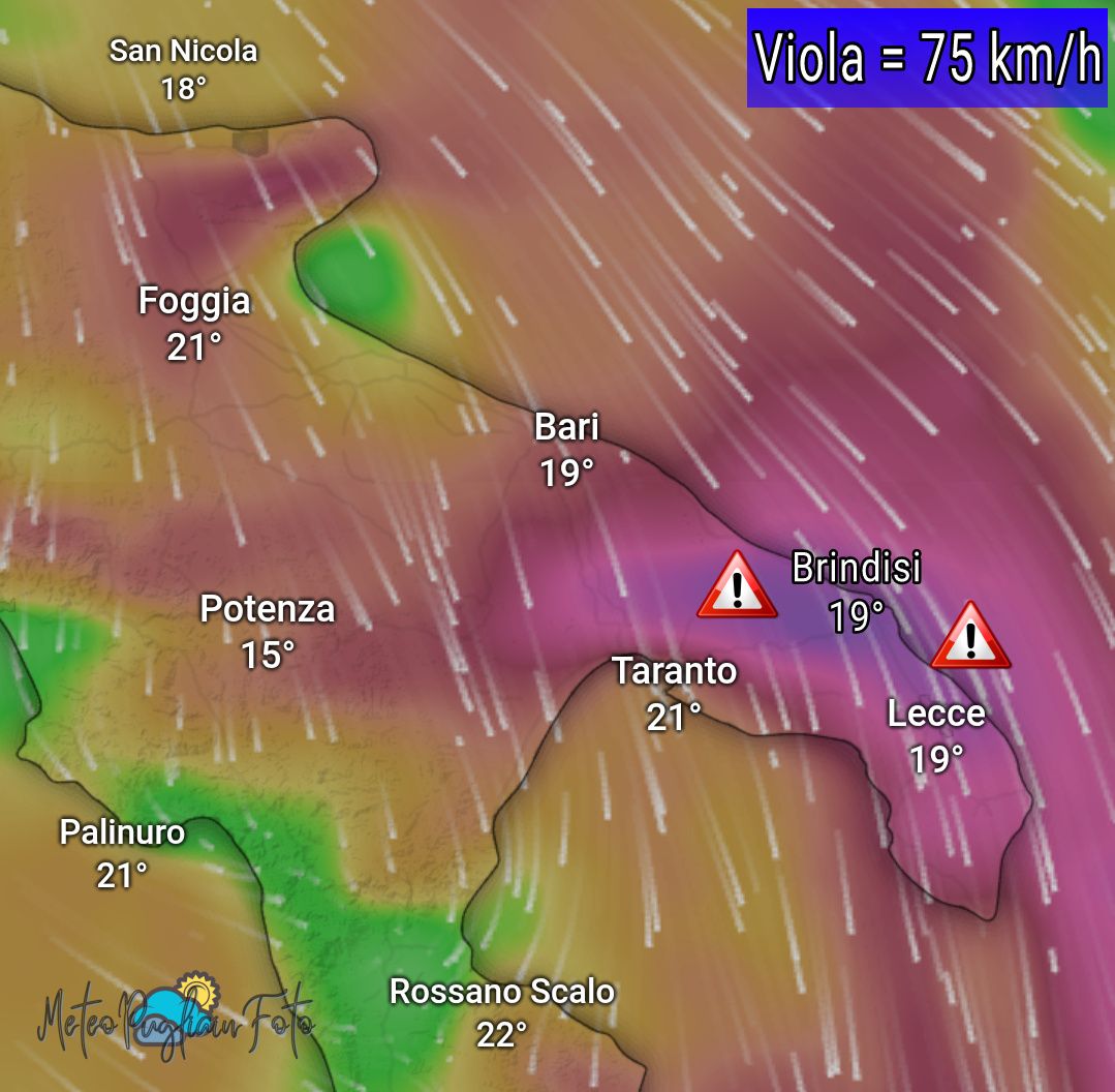 #Domenica all’insegna del forte vento di tramontana che dà metà mattinata andrà rinforzando. Attese raffiche fino a 75 km/h sulla costiera adriatica del Brindisino e Leccese, vento forte su tutta le zone centro meridionali Pugliesi. Medio e basso Adriatico in burrasca con mareggiate lungo le coste del Brindisino e dell’alto Leccese adriatico. Ventilazione più attenuata sui settori settentrionali della regione. Definitiva attenuazione dei venti nel corso della tarda serata.