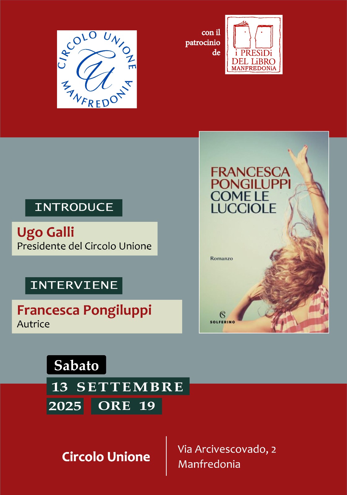 Domani, alle ore 19.00, presso la terrazza della nostra sede, avremo il piacere di accogliere Francesca Pongiluppi, autrice del romanzo Come le lucciole, per la presentazione del suo libro.