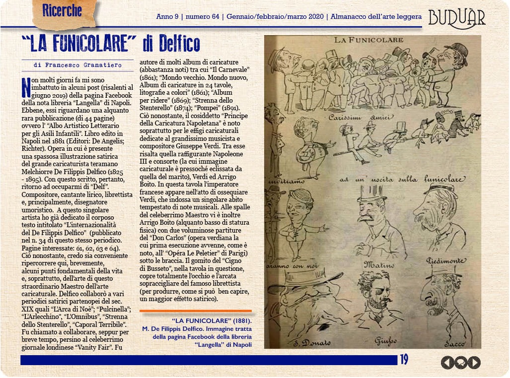 Sull’ultimo numero di “Buduar” l’almanacco dell’arte leggera è presente un dettagliato e corposo articolo a cura del noto caricaturista sipontino Francesco Granatiero sul grande caricaturista M. De Filippis Delfico.