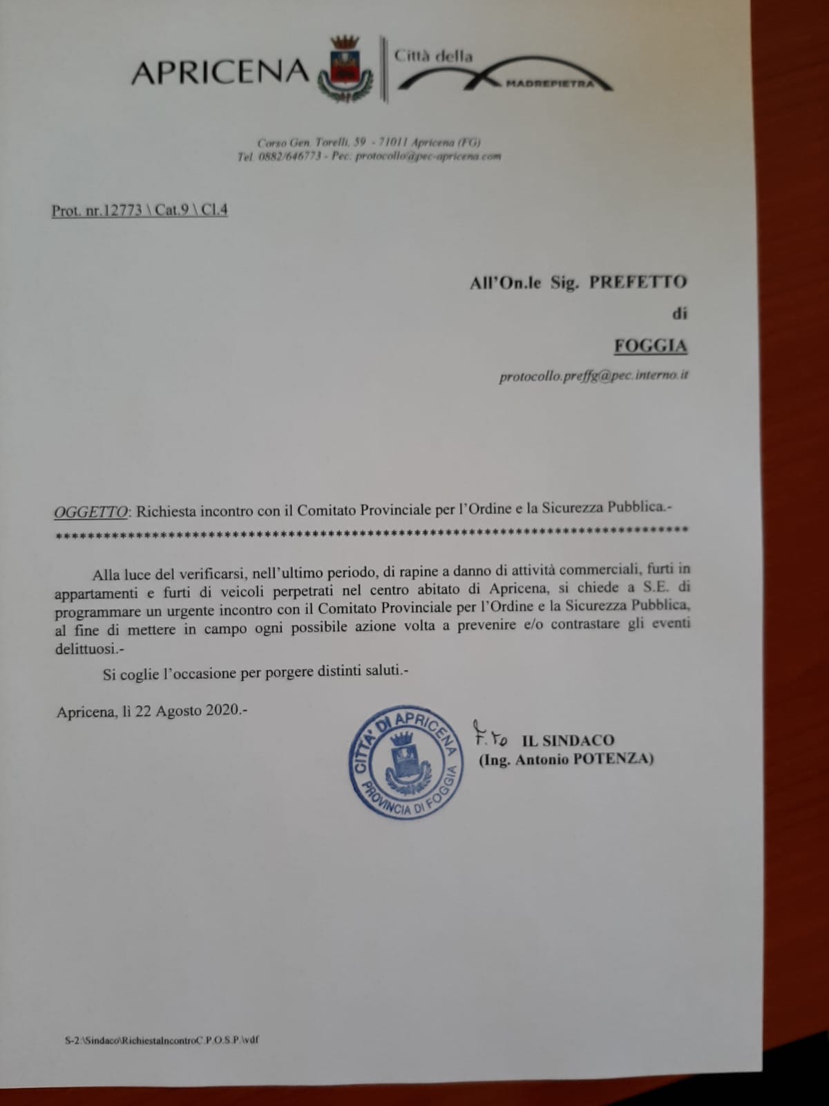 Nel solo mese di agosto, in corso, purtroppo nella nostra città ci sono stati diversi episodi di criminalità. Il Sindaco Antonio Potenza, ha appena invito nota di richiesta al Prefetto di Foggia, molto sensibile ai temi di legalità, di essere invitato al prossimo Comitato Provinciale di Ordine e Sicurezza Pubblica. “Chiederò allo Stato, nelle sue varie componenti, di aumentare il livello di attenzione nella nostra città” – dichiara il Sindaco – ” chiediamo più uomini e mezzi, lo chiede la nostra gente. Abbiamo un territorio molto vasto, incendi dolosi nelle campagne, furti d’auto e in appartamenti, rapine. Ringraziamo le forze dell’ordine che nell’ultimo mese hanno arrestato 3 persone, denunciato diversi altri soggetti, sequestrato 2 piantagioni di marijuana. Lo Stato c’è, non bisogna abbassare la guardia, a noi cittadini l’obbligo di DENUNCIARE SEMPRE, ogni episodio di illegalità. A questi balordi e delinquenti che si macchiano di queste malefatte chiediamo di sparire dalla  nostra città. Ai cittadini e alle attività che hanno subito questi brutti episodi, esprimiamo la nostra vicinanza, con l’impegno di tenere sempre viva l’attenzione verso il tema sicurezza nella nostra comunita” – conclude il Sindaco.