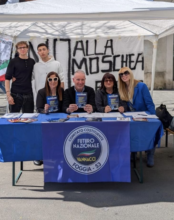 FOGGIA, 20 aprile 2026. Altre 640 firme raccolte per ribadire la richiesta di una maggiore sicurezza in città e un secco No alla costruzione di una moschea a Foggia, e 28 nuove tessere al partito. Un altro straordinario successo per il Comitato Costituente Locale n. 53 di Futuro Nazionale, la neonata formazione politica ispirata dal gen. Roberto Vannacci, scesa in piazza nel secondo fine settimana consecutivo con un gazebo per un contatto diretto con la cittadinanza e per illustrare le battaglie identitarie già intraprese. Iniziative non isolate ma che continueranno anche nelle prossime settimane, per i mesi di aprile e maggio.