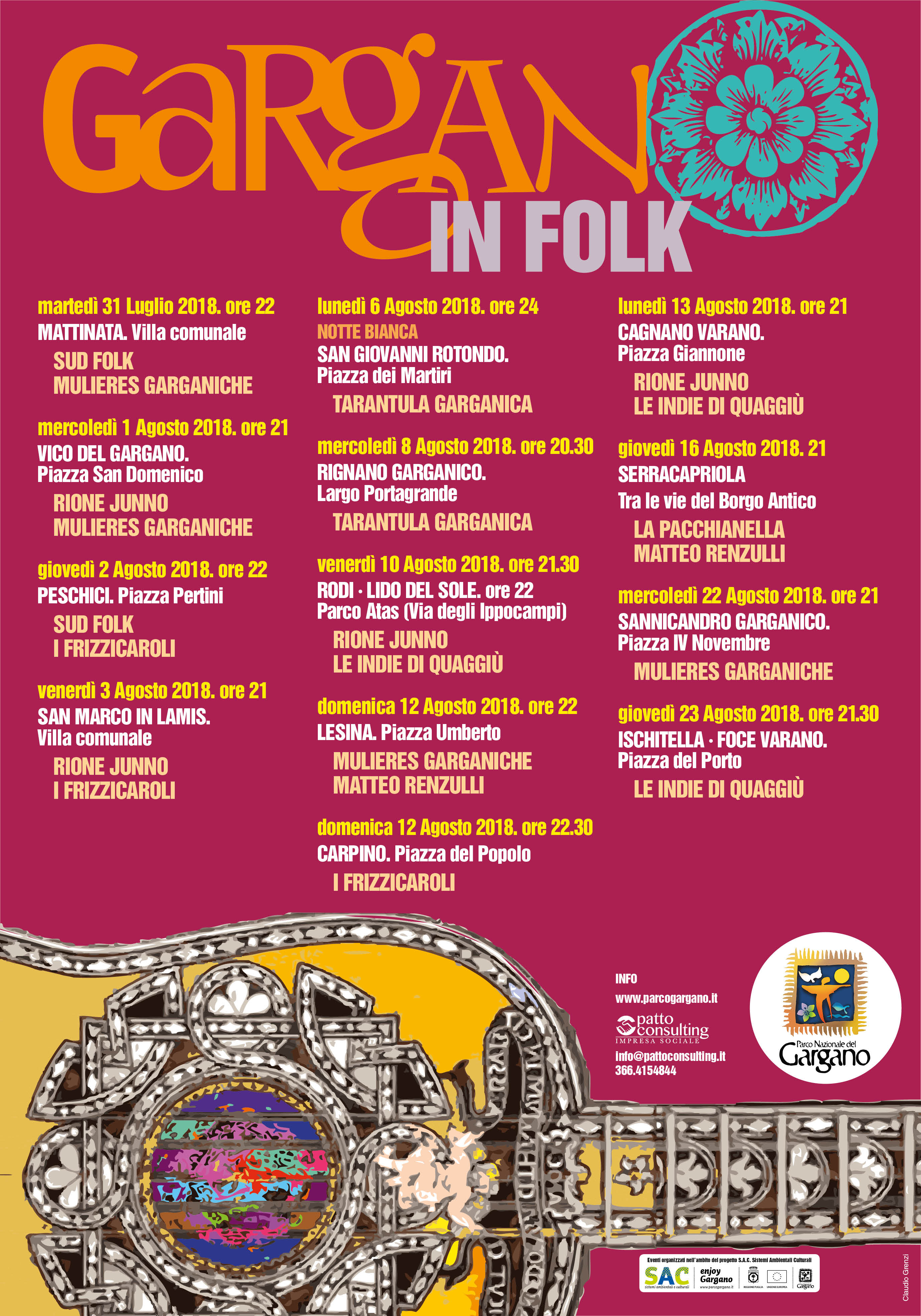 Dopo il successo delle prime tappe e la pausa del week end, Gargano in Folktorna a rallegrare le piazze dei comuni garganici. L’evento, organizzato dalParco Nazionale del Gargano, porta in tour la tradizione popolare con alcuni dei gruppi più rappresentativi di questo territorio. Nelle piazze di Mattinata, Vico del Gargano, Peschici e San Marco in Lamis il pubblico ha risposto con grande entusiasmo ed apprezzamento alle serate animate da gruppi consolidati come i Rione Junno, i Sud Folk, Le MulieresGarganiche, ma anche a quelle condotte con maestria dalle nuove generazioni di suonatori come I Frizzicaroli, gruppo composto da oltre 50 allievi dell’Istituto comprensivo ‘Dante-Galiani’ di San Giovanni Rotondo.