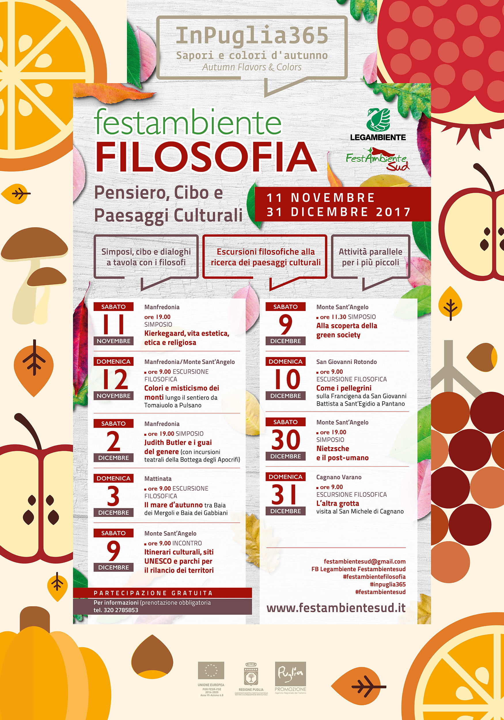 Prende il via questo weekend la seconda edizione di Festambiente Filosofia – Pensiero, cibo e paesaggi culturali, la rassegna ideata dal circolo Legambiente FestambienteSud e realizzata grazie all’avviso pubblico “InPuglia 365 Sapori e colori d’autunno”. Le iniziative in programma sono totalmente gratuita, ma bisogna prenotarsi.