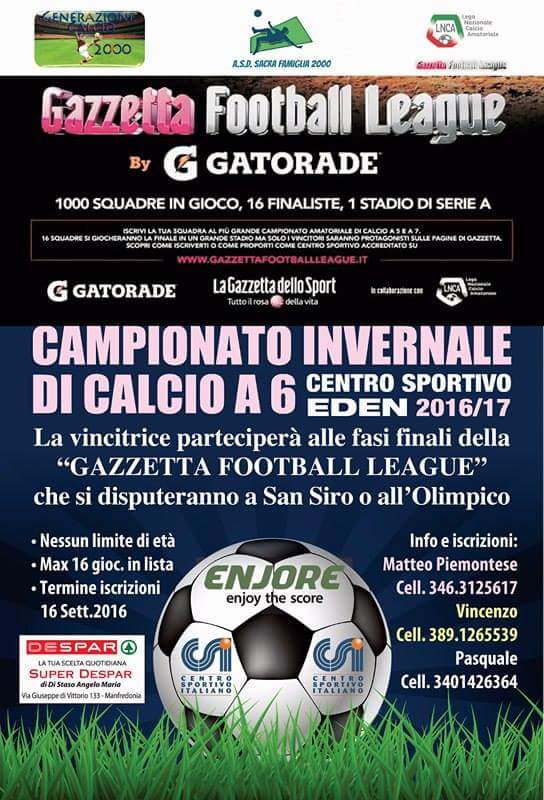 L’asd Sacra Famiglia 2000 in collaborazione con La Gazzetta dello Sport, Centro Sportivo Italiano e Generazionecalcio2000 presenta la tappa locale del più prestigioso torneo amatoriale di calcio a 6 d’Italia: Gazzetta Football League!