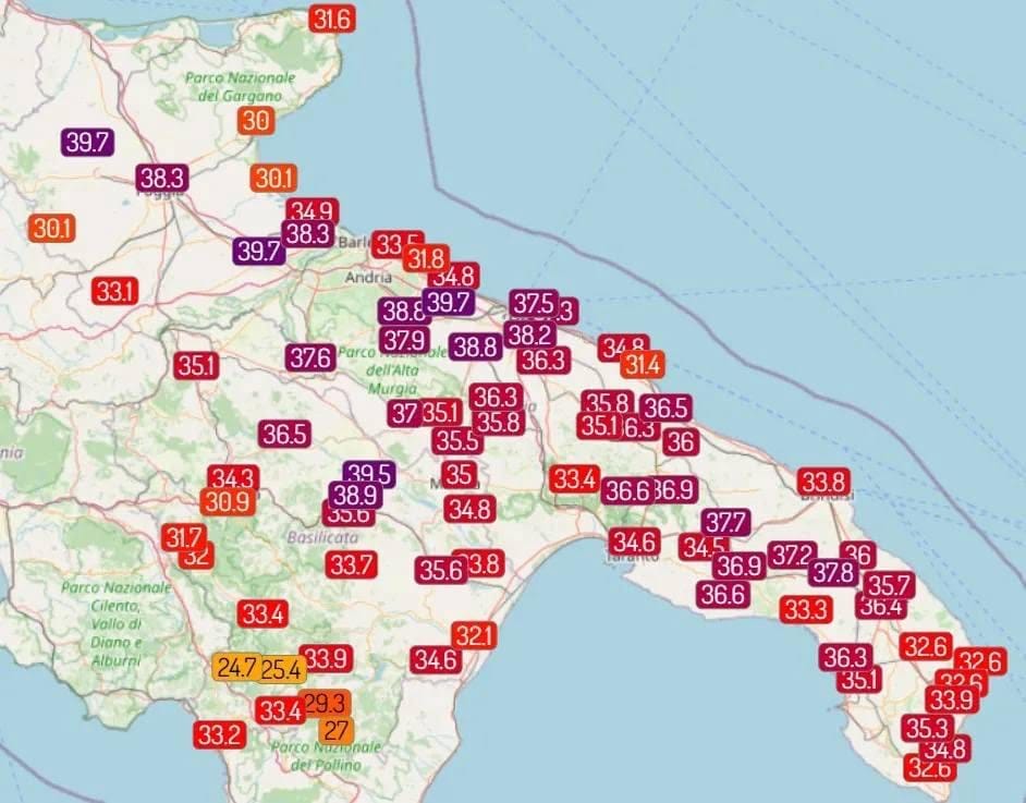 🔥 Giornata molto calda su Puglia e Basilicata. I 40 gradi sono stati solo sfiorati, tuttavia si registrano temperature molto elevate lungo le zone interne di entrambe le regioni, in particolare sul tavoliere, bat/nord barese, zone interne dell’alto Salento e entroterra materano.