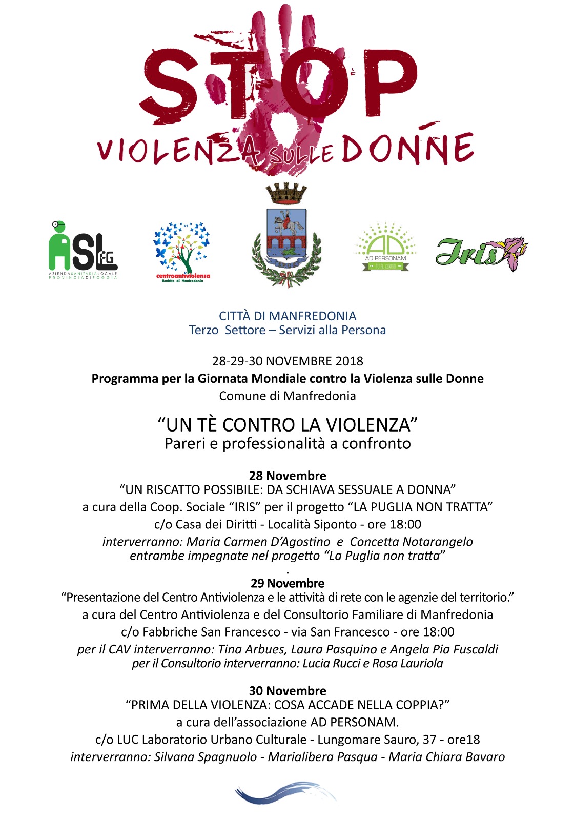 Si intitola “Un tè contro la violenza” il programma proposto dall’assessorato ai Servizi Sociali del Comune di Manfredonia in collaborazione con la ASL FG, il Centro Antiviolenza, l’Associazione Ad Personam e la Cooperativa Iris per celebrare la giornata internazionale contro la violenza sulle donne.
