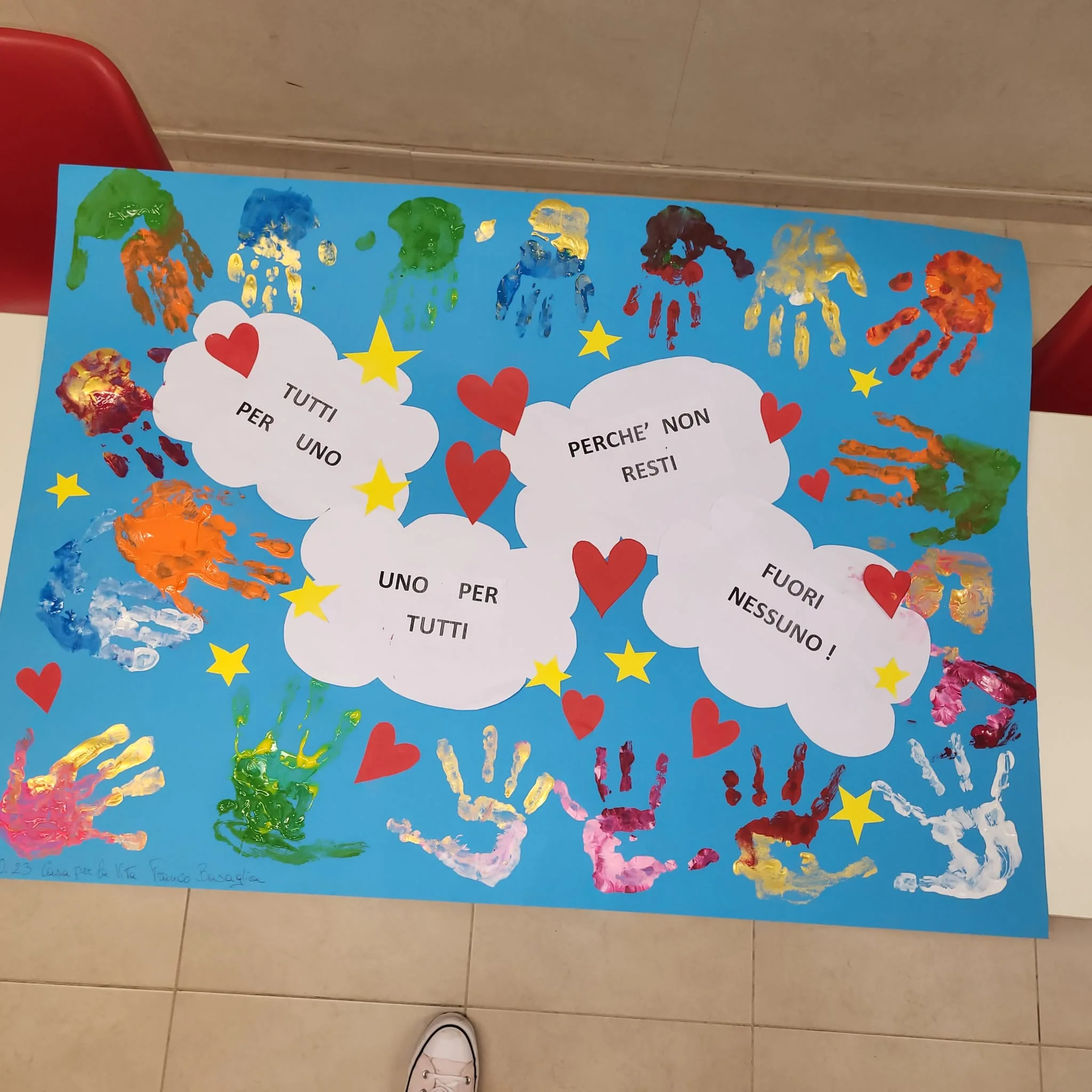 Ad attendere il mio arrivo, per aiutarmi nella ripida salita verso le sale parrocchiali, il dott. Matteo Prencipe, impeccabile Coordinatore di Comunità. Immediato l’entusiasmo dei ragazzi della parrocchia nel realizzare assieme a Toni, a Franco, a Vincenzo ed altri ospiti della Casa un cartellone coloratissimo finalizzato a rappresentare la giornata Mondiale della Salute Mentale, un poster dallo sfondo blu con stelle e cuori a significare che c’è un mondo in cui tante mani colorate sono l’unione di tutti gli individui, unici tra loro.