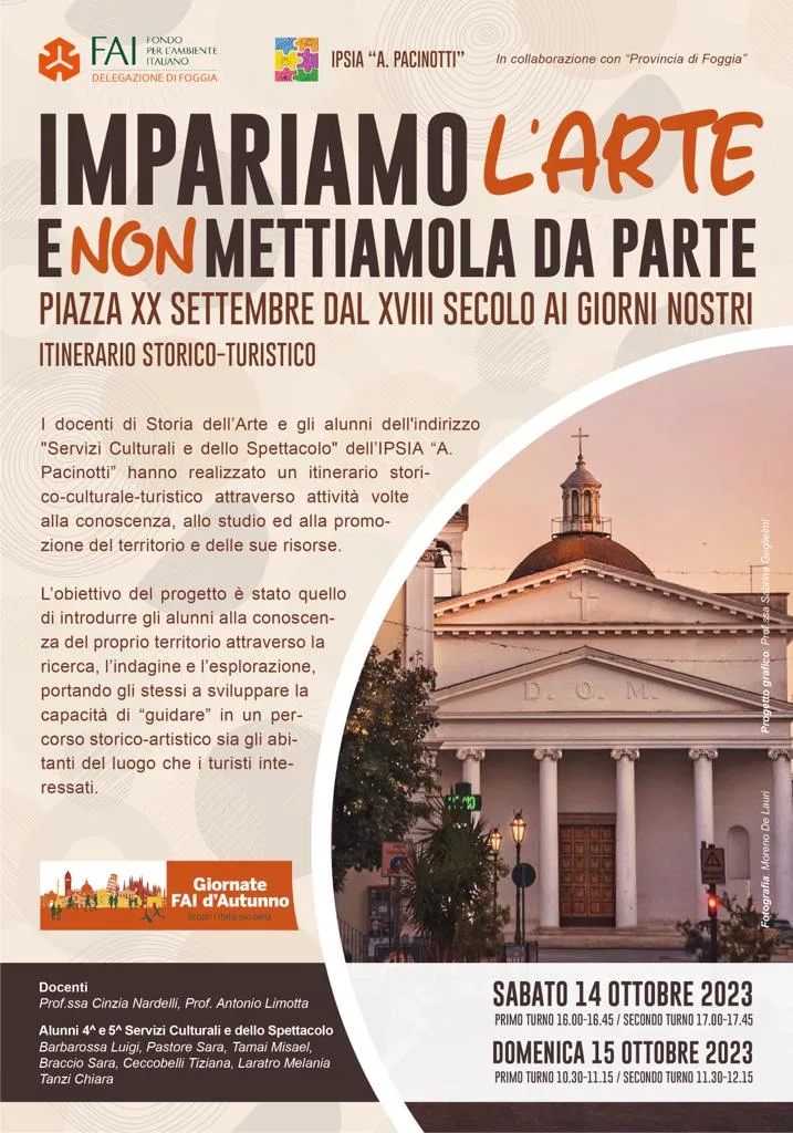 A Foggia gli alunni dell’IPSIA Pacinotti (IV e V Servizi Culturali e dello Spettacolo) saranno gli Apprendisti Ciceroni che guideranno il pubblico nella conoscenza di piazza XX Settembre, tra le più omogenee dal punto di vista urbanistico e architettonico, e della antica pratica della Transumanza che in palazzo Dogana aveva il suo centro amministrativo. Saranno invece i Narratori facenti parte del Gruppo FAI Gargano ad illustrare la bella chiesa di Sant’ Orsola (o del Purgatorio) a san Giovanni rotondo. La Chiesa di Sant’Orsola costruita a partire dal 1596 in stile barocco, è la più antica e più ricca di arte tra quelle della cittadina garganica. La visita al Borgo Antico di Pietramontecorvino, infine, è affidata a guide fornite dalla locale Pro Loco e sarà inserita nel programma della manifestazione “Suoni, Sapori, Colori” che l’Amministrazione Comunale organizza con successo da numerosi anni con eventi culturali e gastronomici.