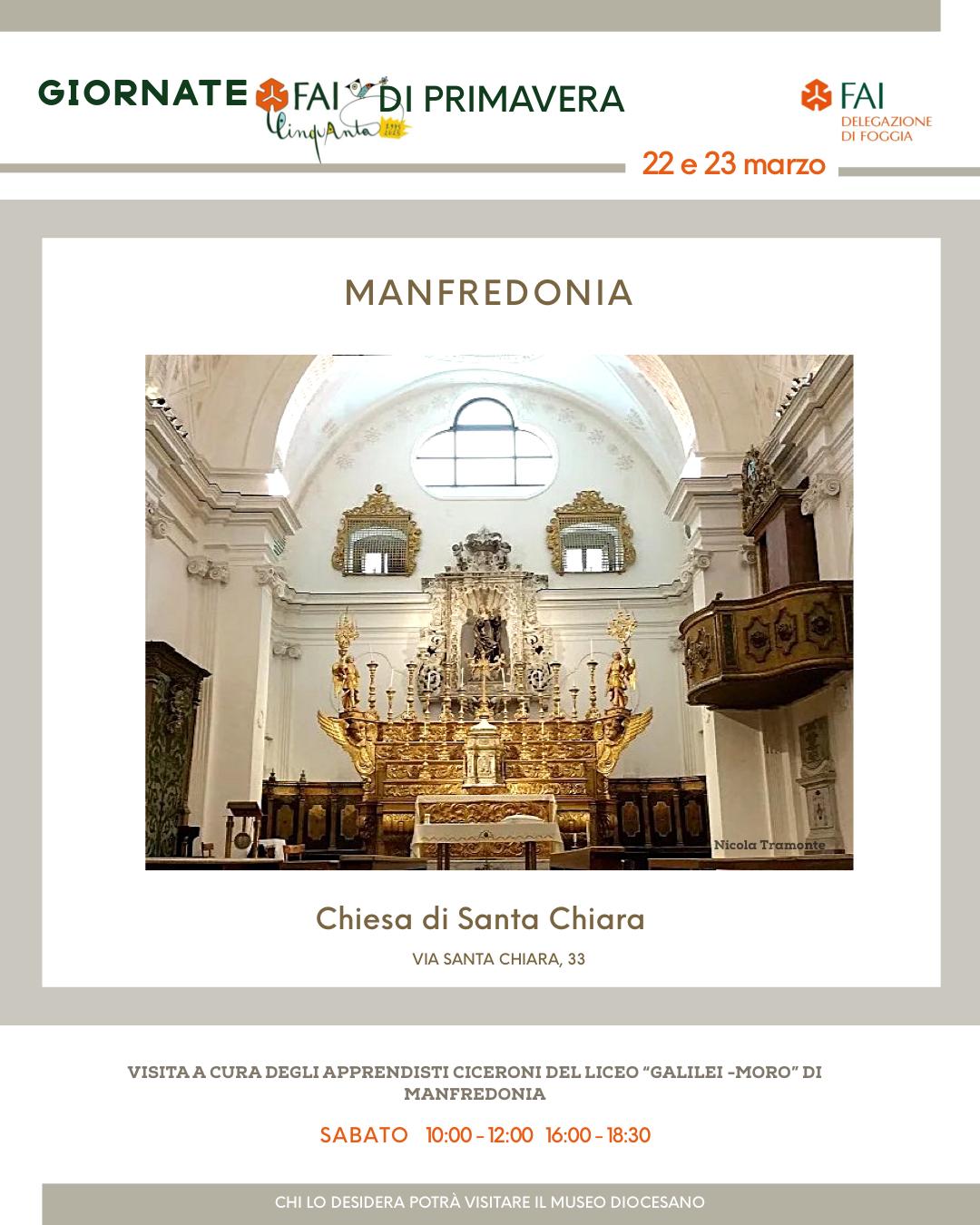 Quest’anno, grazie all’impegno della Delegazione FAI di Foggia e della responsabile dell’iniziativa su Manfredonia Apollonia Rinaldi, saranno aperti eccezionalmente al pubblico due luoghi simbolo del patrimonio monumentale sipontino appartenenti alla Diocesi: la Chiesa di Santa Chiara e il Museo Diocesano. Le visite guidate saranno affidate ai volontari del FAI e agli studenti del Liceo Galilei-Moro di Manfredonia, formati appositamente per questa speciale occasione. Una sinergia virtuosa che coinvolge i giovani, promuove il volontariato culturale e valorizza il territorio.