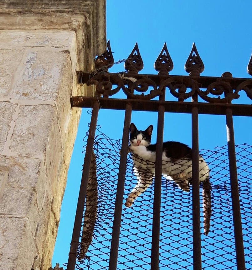 Manfredonia . Ho trovato un gattino – in posa piccino , con gli zampini e musino, tra il filo filato di un intreccio arrugginito – io di sotto lo guardavo – il micio quasi ipnotizzato – ma con un colpo di clik a tradimento; lo fotografato due scatti – lasciandomi serio in un momento da macello…dove il tempo ha alzato la mano ed arreso e stanco al vivere pandemico…proprio tra l’aria che passa ma mi tocca a malapena il respiro al naso… stufo della stupidità in circolo dell’essere umano. Sono stanco di ascoltare il tempo del Caino moderno, che fa scorrere il sangue dagli occhi – mentre nega che ha le mani e rivoli traboccanti di giorni grigi e di viali offuscati .