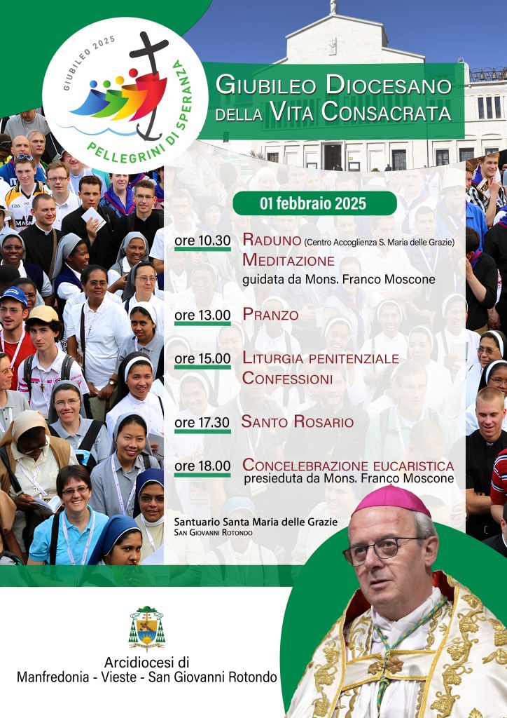 Sabato 1 febbraio 2025 presso il Santuario Santa Maria delle Grazie in San Giovanni Rotondo si terrà nel territorio diocesano il Giubileo della Vita Consacrata.