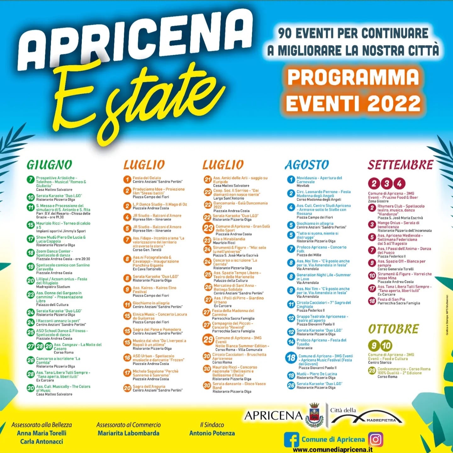 “Siamo soddisfatti ed orgogliosi del lavoro svolto per la rassegna estiva”- dichiarano Potenza, Torelli e Labombarda- “ringraziamo tutte le associazioni, i commercianti e i proponenti dei vari eventi. Abbiamo costruito il migliore programma estivo degli ultimi anni. La città sta vivendo una nuova Primavera, siamo diventati una comunità attrattiva e apprezzata, vogliamo continuare a crescere e migliorare la qualità della vita di tutti gli apricenesi”.