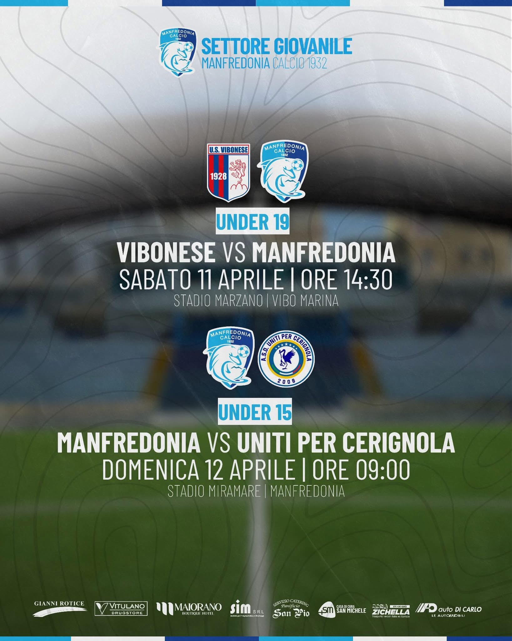 Si parte domani, sabato 11 aprile, alle ore 14:30, con l’Under 19 impegnata nell’ultima giornata di campionato. I biancocelesti faranno visita alla Vibonese allo stadio di Vibo Marina. Uno scontro diretto tra due squadre appaiate a quota 23 punti: il Manfredonia cerca il riscatto dopo il ko interno con il Nardò, mentre i calabresi tornano in campo dopo il turno di riposo.