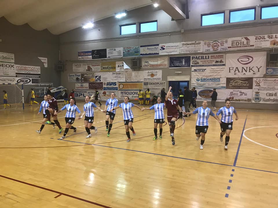 Nella ripresa, ancora la foggiana concretizza al meglio una veloce ripartenza e poi di giustezza realizza la sua tripletta. Un nuovo autogol e un piatto sotto l’ incrocio di capitan #Papapicco, precedono il rigore di #Capalbo. Le ultime tre reti portano ancora le firme di #Damato, e altri 2 di #Volpicella per 17a0 definitivo.