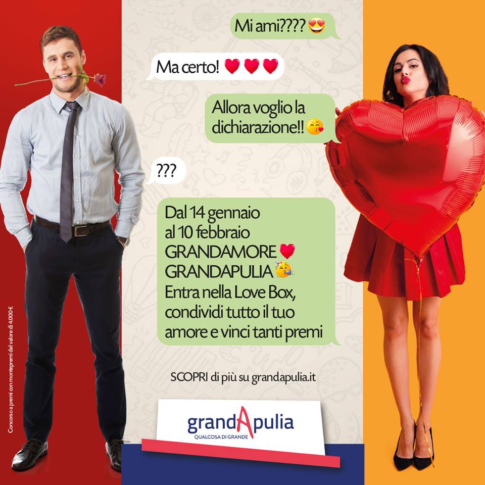 Per farlo basta una telefonata, un messaggio, una foto, un video cui seguirà la compilazione di un coupon che, in base al destinatario scelto, consentirà di partecipare al concorso ‘GRANDAMORE GRANDAPULIA’ e di vincere tanti premi e buoni acquisto che addolciranno ancor più il periodo di San Valentino.