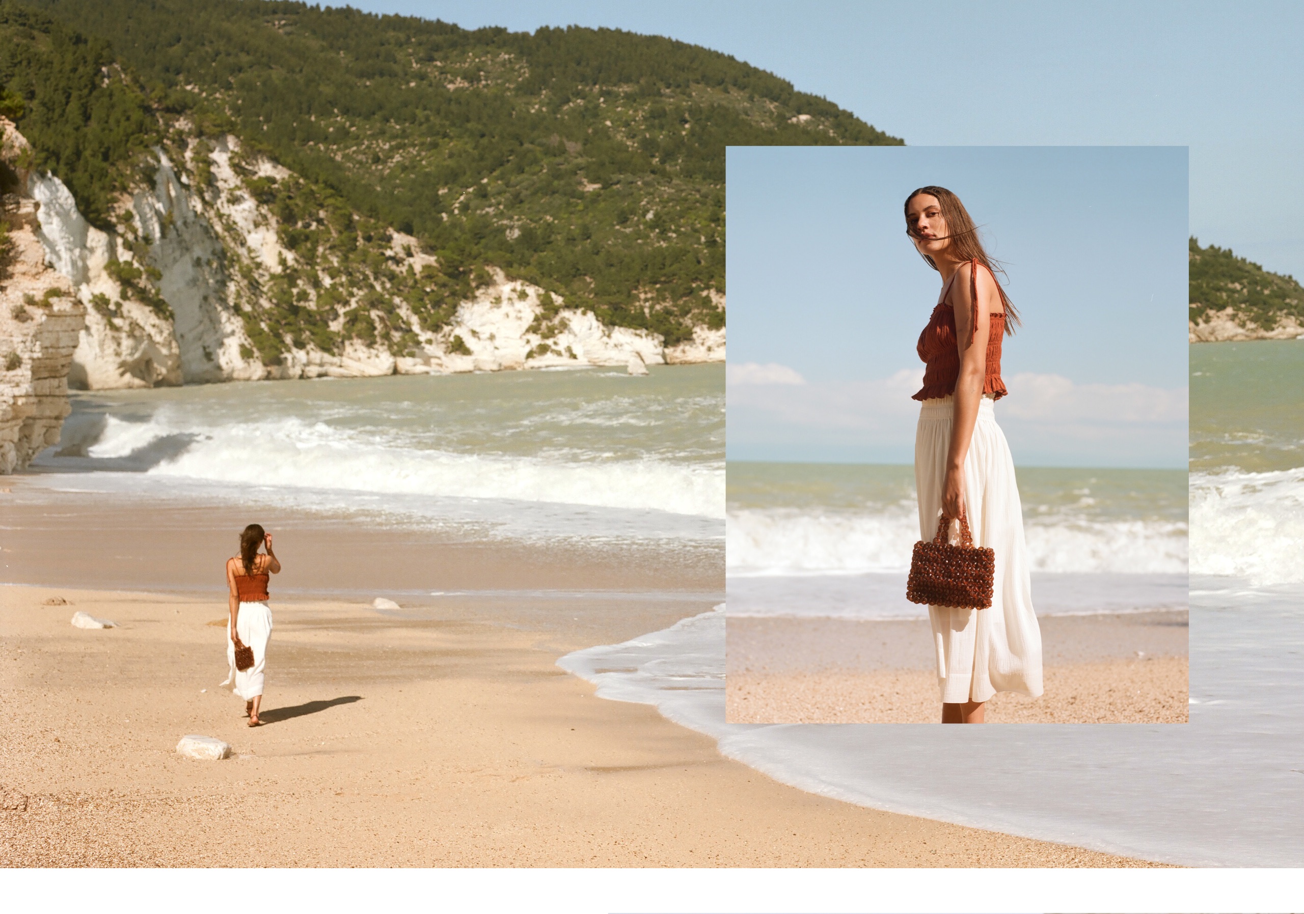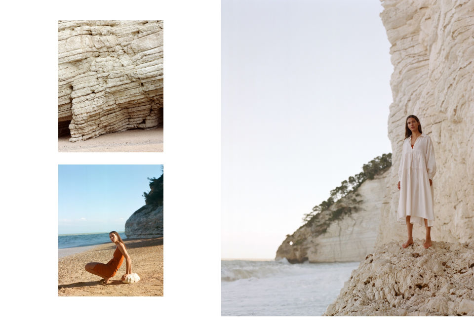 A fare da sfondi alle sinuose modelle che indossano abiti leggeri, colori vivaci ed accessari ideali per un guardaroba della prossima estate, ci sono le bianche falesie e il mare critallino del Gargano.
