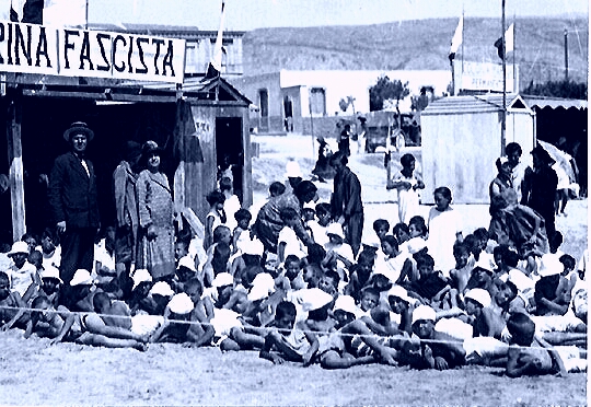 I bambini della “Colonia Fascista“ venivano messi tutti in fila e sorvegliati dagli insegnanti a vista. Alle loro spalle Macchia e Monte Sant’Angelo. I bambini si guardavano negli occhi, e detto in gergo toscano le braccia sui ginocchi, sguardi un po’ malinconici, sotto il naso degli insegnanti vestiti fuori l’uscio della “cabina fascista”. I bambini prendevano vita , aria pulita di mare…e la possibilità di tuffarsi in mare…sotto l’attenta osservazione degli insegnanti del fascio.