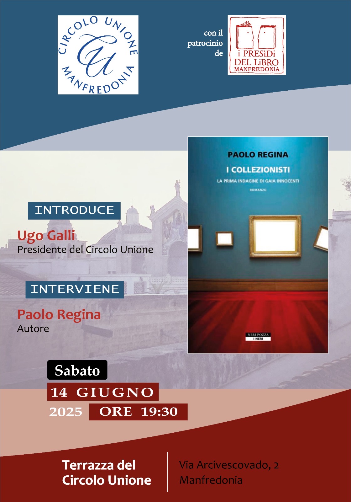 Sabato,14 giugno, alle ore 19.30, con l’autore, presenteremo “ I collezionisti”, romanzo avvincente, segnato da una scrittura appassionante e raffinata, molto piacevole, spesso divertente e di un umorismo sapientemente misurato.
