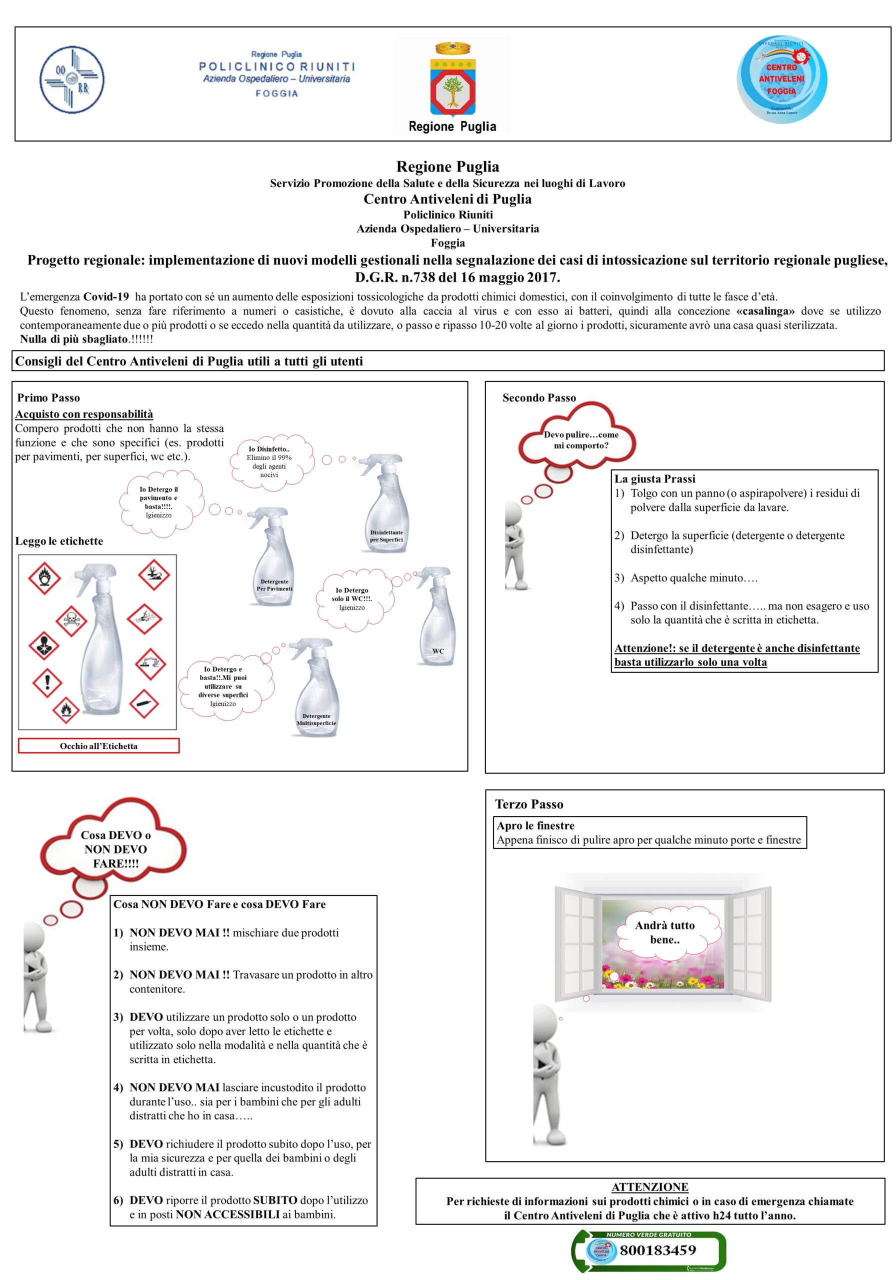 Nell’ambito del progetto regionale “Implementazione di nuovi modelli gestionali nella segnalazione dei casi di intossicazione sul territorio regionale pugliese” si è rilevato, infatti, un incremento di esposizioni dovute a prodotti chimici, nel trimestre febbraio-aprile 2020. Il danno è dovuto ad una frenetica e ripetuta attività di pulizia degli ambienti domestici, nella maggioranza dei casi eseguita con scarsa informazione e conoscenza dei prodotti.