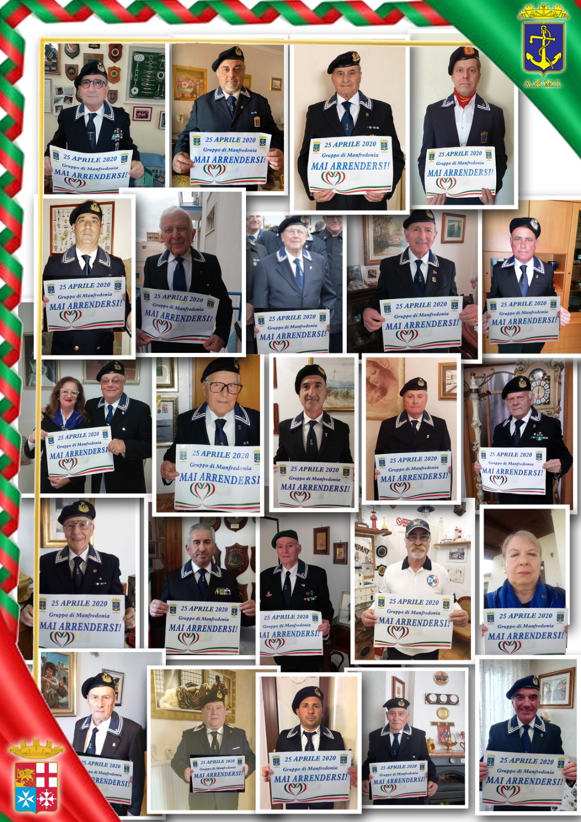 Il mondo si è fermato e la gente ha scoperto la paura dell’isolamento, la mancanza dei rapporti interpersonali, l’impossibilità di godere della natura. “L’elettronica non soddisfa l’esigenza di una carezza, di un abbraccio, di un bacio, e soprattutto di un saluto per un addio al caro estinto”, spiega il Vice Presidente Francesco Paolo Fortunato dell’ANMI Manfredonia, che con l’avallo del Presidente Lgt. Cav. Leonardo Salice, ha contattato tutti i soci per realizzare uno scatto in cui mostrano la frase MAI ARRENDERSI legata simbolicamente al 25 aprile, “quando c’è stato l’annientamento della dittatura nazifascista che tanto tormento ha provocato alle popolazioni e ci è stata restituita la libertà”.