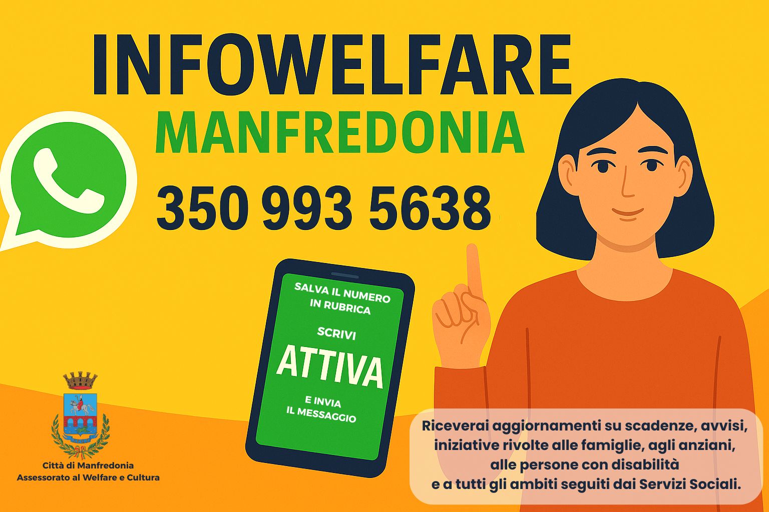 Un nuovo canale informativo, semplice, gratuito e immediato, è ora a disposizione di tutte le cittadine e i cittadini. Il Comune di Manfredonia ha attivato il servizio “InfoWelfare Manfredonia” tramite WhatsApp, con l’obiettivo di rendere più veloce e diretta la comunicazione sui servizi di welfare, aggiornando la popolazione su scadenze, avvisi, iniziative rivolte alle famiglie, agli anziani, alle persone con disabilità e a tutti gli ambiti seguiti dai Servizi Sociali.