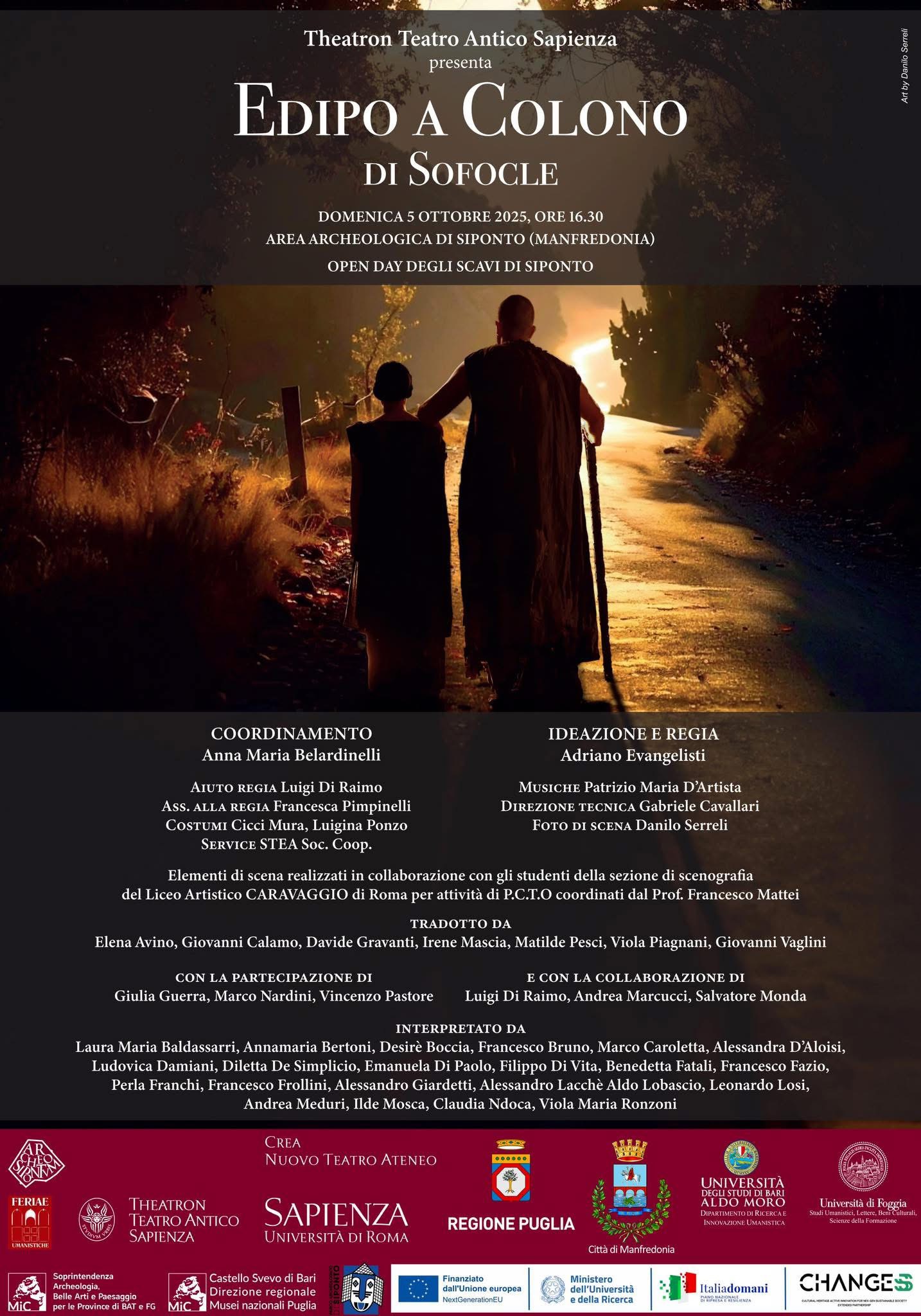 Il 5 ottobre Open Day degli scavi di Siponto. Quest’anno una grande novità! Teatro antico nell’area archeologica di Siponto. Edipo a Colono di Sofocle messo in scena dalla compagnia teatrale della Sapienza Università di Roma. Vi aspettiamo