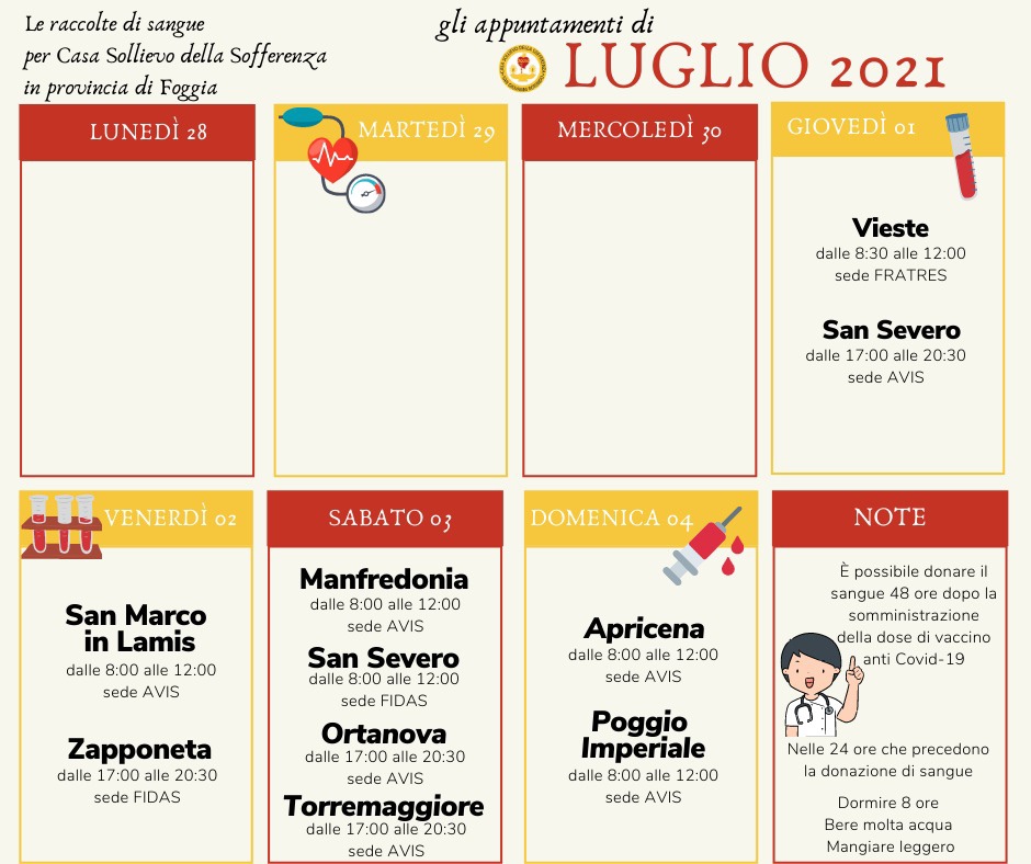 Chi lo desidera può effettuare la propria donazione in uno dei Comuni della provincia di Foggia (a Manfredonia sabato 3 luglio dalle ore 8 alle 12 c/o la sede Avis) in cui è organizzata la campagna di raccolta sangue.