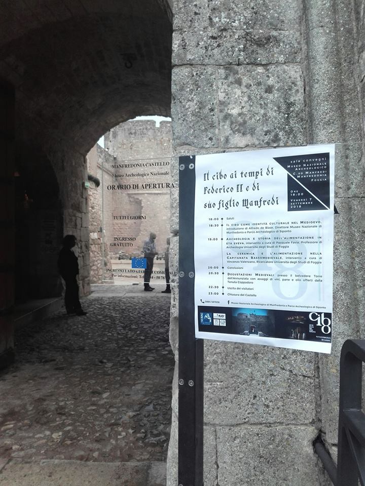In occasione dell’”Anno del Cibo italiano“, presso il Museo Nazionale Archeologico di Manfredonia, venerdì 7 settembre, ha avuto luogo il convegno “Il cibo ai tempi di Federico II e di suo figlio Manfredi” seguito dalla degustazione sul panoramico bastione di alcuni cibi d’epoca medievale offerti dalla Tenuta Coppadoro con la partecipazione dell’Associazione Italiana Sommelier.