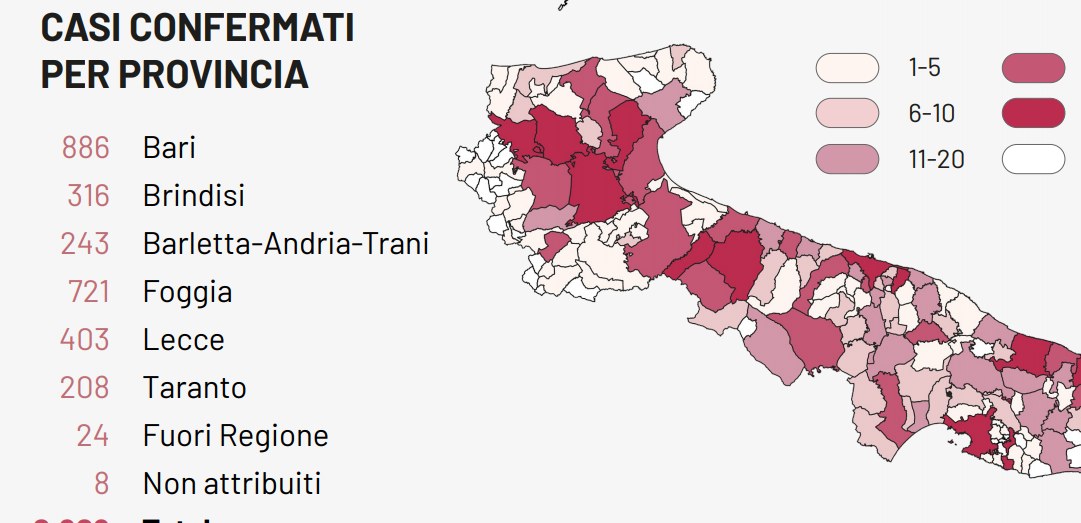 Il totale dei casi positivi Covid in Puglia è di 2.809 così divisi: