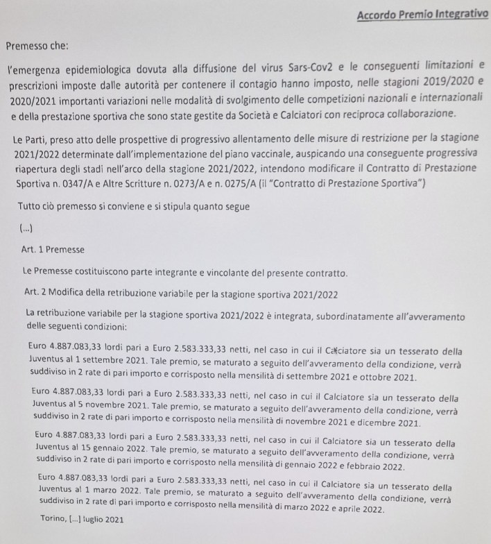 Il Corriere della Sera pubblica la ‘carta che non dovrebbe esistere’ tra la Juventus ed il campione portoghese Cristiano Ronaldo.