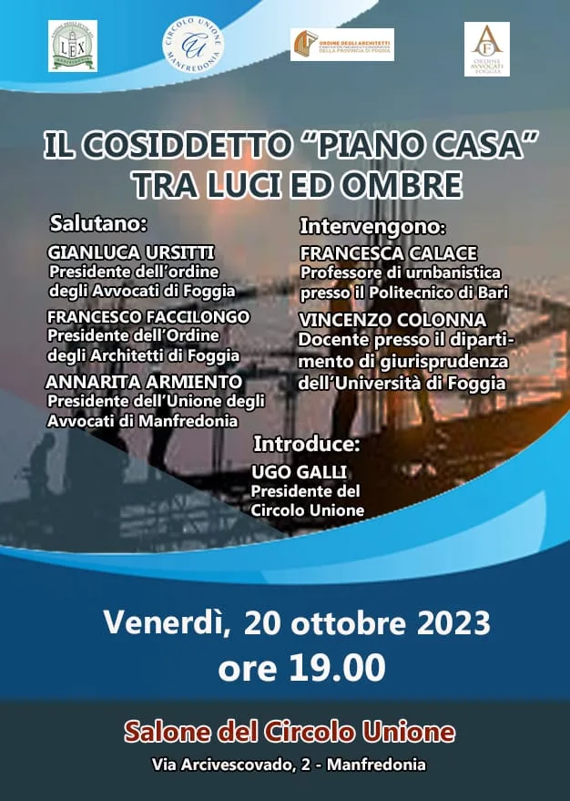 Le descritte problematiche saranno sviscerate,venerdì,20 ottobre, alle ore 19.00,presso la sede del Circolo Unione, da Francesca Calace, Professore di urbanistica, presso il Politecnico di Bari e da Enzo Colonna, docente del Dipartimento di giurisprudenza dell’Università di Foggia.