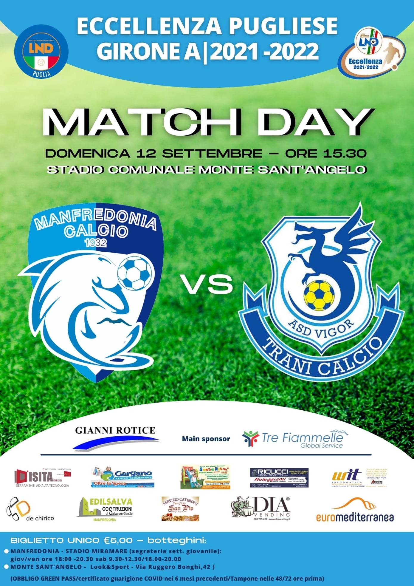 Per l’accesso allo stadio è obbligatorio il green pass o tampone nelle 24/48 ore precedenti o certificato di avvenuta guarigione covid nei mesi precedenti.