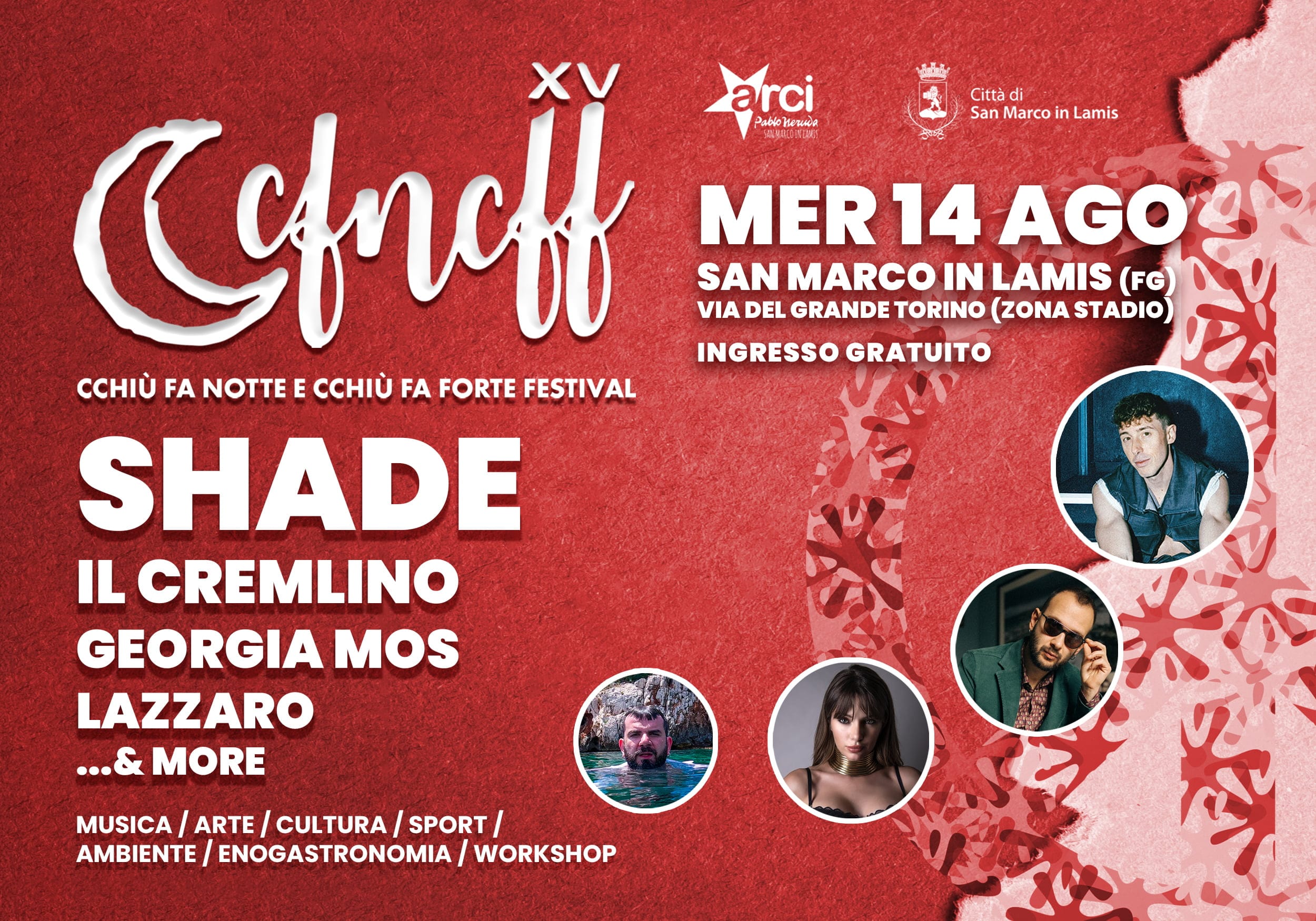 | Laboratori, workshop, escursioni, enogastronomia, sport ma soprattutto talk e musica con gli attesissimi ospiti: Shade, Il Cremlino, Georgia Mos e Lazzaro. Mercoledì 14 agosto 2024 a San Marco in Lamis, sul Gargano. |