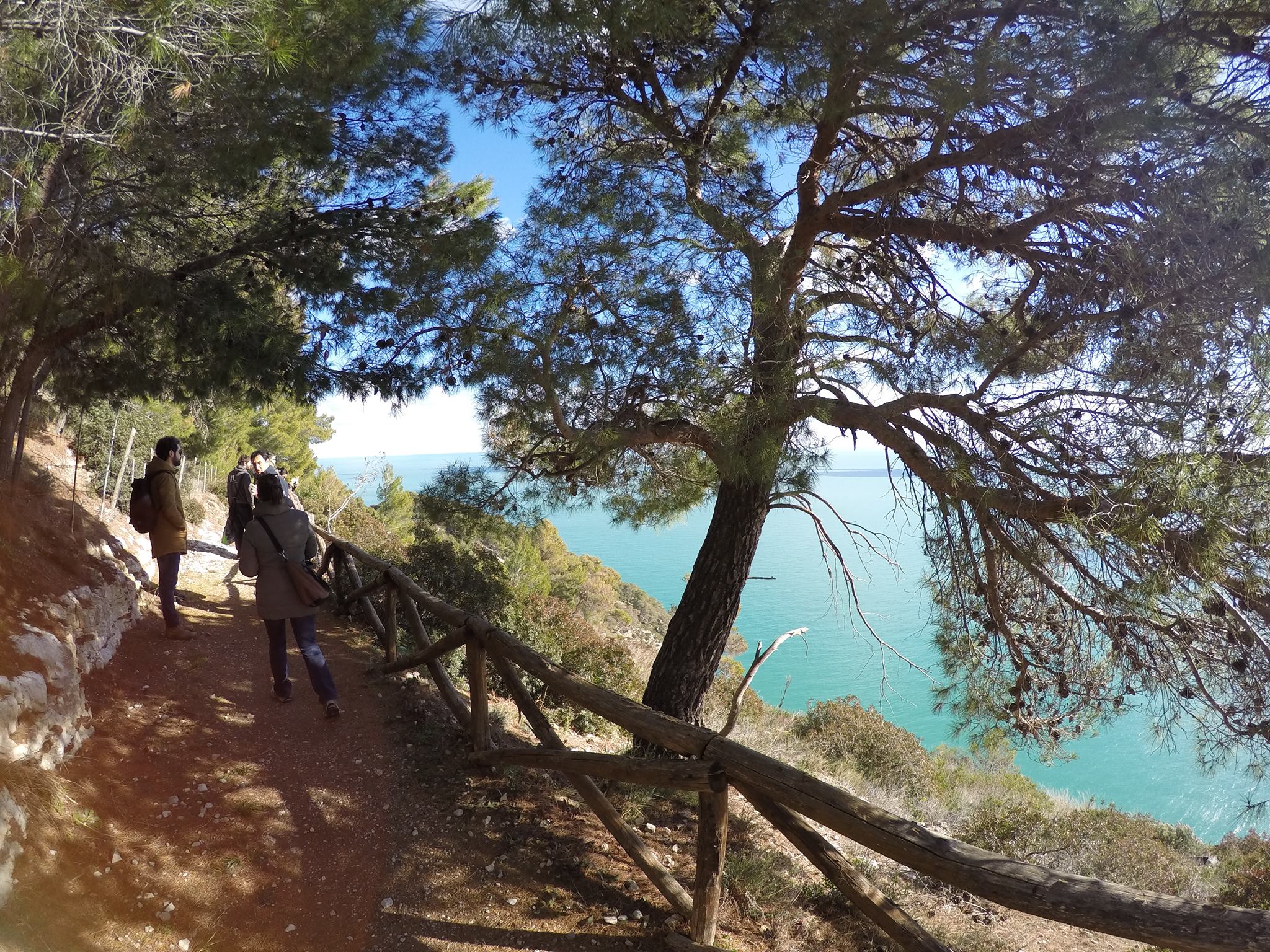 Il sentiero è accarezzato dal mare a destra e dalla foresta di pino d’aleppo alla sinistra.