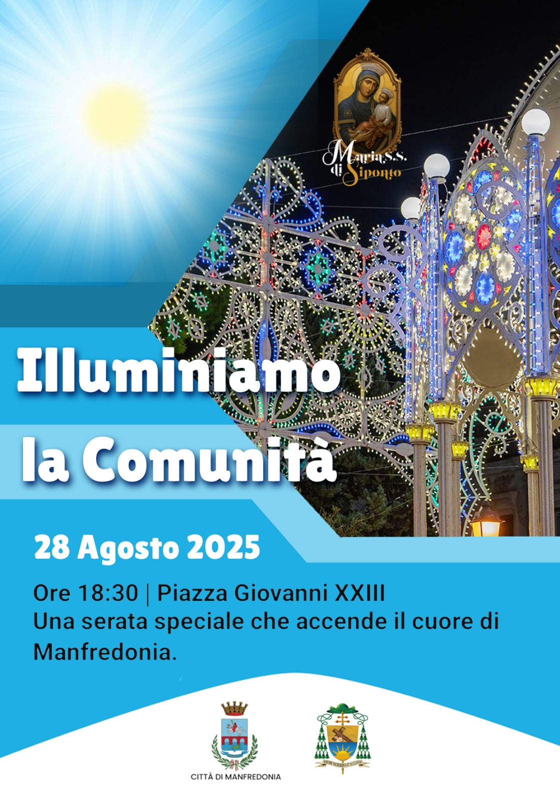 Prendono ufficialmente il via i festeggiamenti in onore della Madre Maria SS. di Siponto con “Illuminiamo la Comunità”, una serata speciale che accende il cuore di Manfredonia.
