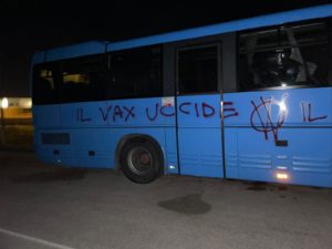 Scritte “No vax” all’alba su alcuni mezzi delle società Stp e Seat, alla periferia di Gallipoli. Si tratta, nello specifico, di nove bus imbrattati con della vernice spray. “Se non puoi dire di no sei schiavo”, o ancora “Il vax uccide il governo”.