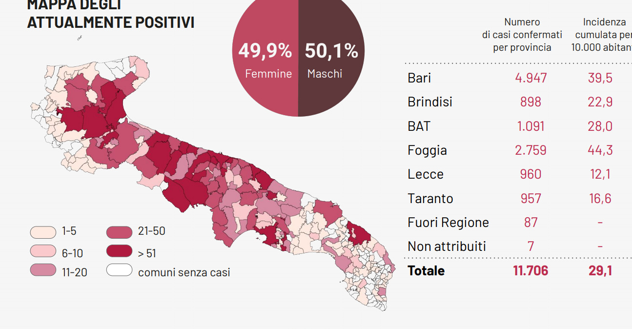 Il totale dei casi positivi Covid in Puglia è di 11.706, così suddivisi: