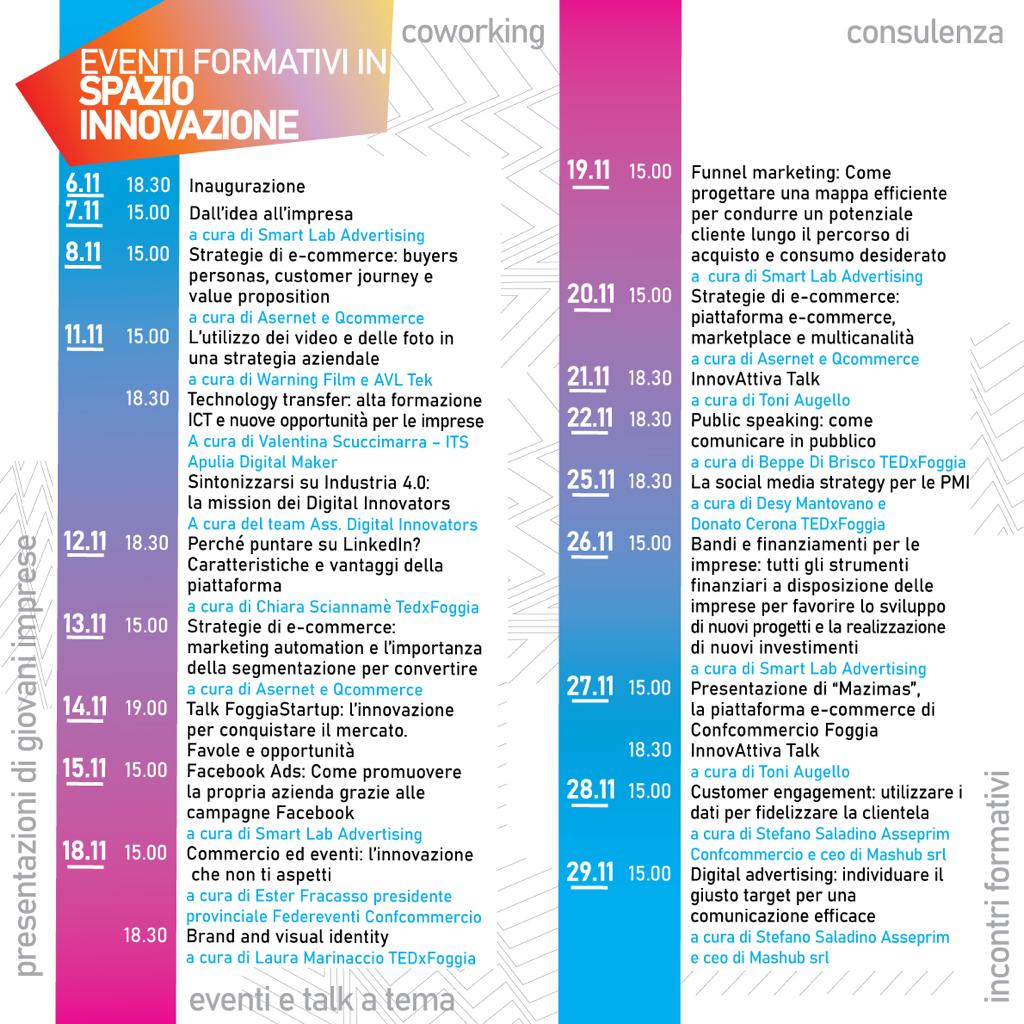 Dal 7 novembre ogni giorno ci sarà un incontro formativo totalmente gratuito tenuto da esperti del settore Digital&Innovation. Gli incontri sono a numero chiuso e per prenotarsi è necessario mandare una mail a comunicazione@confcommerciofoggia.it indicando il proprio nome e cognome, titolo del seminario che si vuole seguire ed eventuale impresa a cui si appartiene.