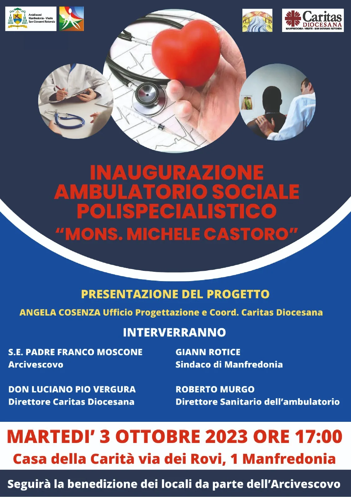 Sarà inaugurato, martedì 3 ottobre, presso la Casa della Carità a Manfredonia, l’Ambulatorio sociale polispecialistico “Mons. Michele Castoro”.