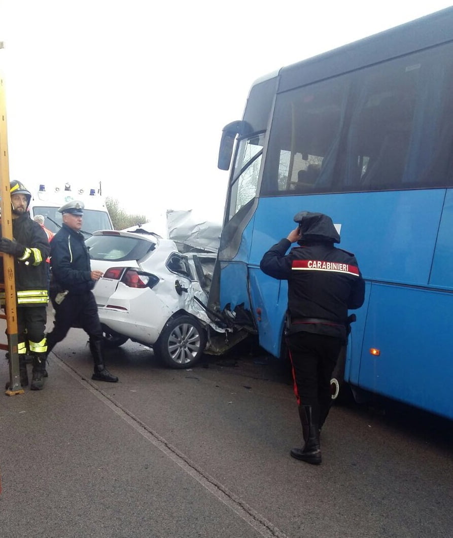 In data odierna, un pullman di linea delle Ferrovie del Gargano è rimasto coinvolto in un incidente stradale sulla provinciale “45” per San Giovanni Rotondo. Il mezzo – in servizio sulla tratta Cerignola-S.Giovanni – veniva impattato da un’autovettura che procedeva sull’opposto senso di marcia e che invadeva la corsia dell’autobus. Dalle foto si evince come l’autobus abbia cercato di evitare lo scontro accostando ancora più nel tentativo di evitare l’impatto con la macchina il cui conducente è deceduto sul colpo.