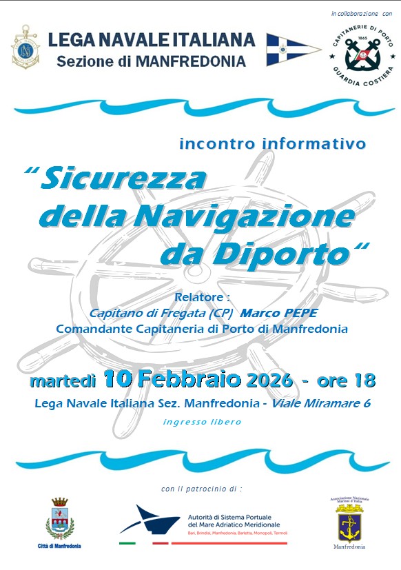 Martedì 10 febbraio 2026, alle ore 18, a Manfredonia, presso la sede di Viale Miramare della Lega Navale, si terrà un incontro informativo sulla “Sicurezza della Navigazione da Diporto”, promosso dalla Lega Navale Italiana, Sezione di Manfredonia, in collaborazione con la Capitaneria di Porto di Manfredonia – Guardia Costiera.