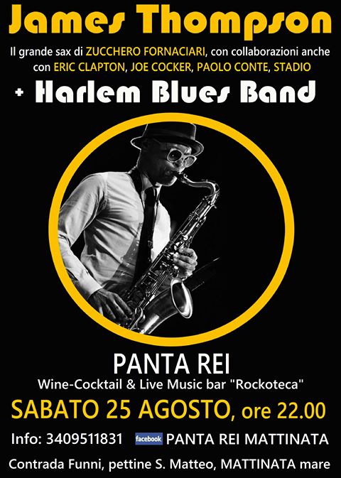 La Harlem Blues Band, dopo essersi esibita nei migliori festival blues d’Italia accanto alle più importanti celebrità del blues internazionale, ritorna come ogni anno per la rassegna PANTAREI IN BLUES. Uno show esplosivo e coinvolgente che vedrà protagonista il celebre sassofonista e polistrumentista JAMES THOMPSON, noto in tutto il mondo per le sue decennali collaborazioni con Zucchero, Paolo Conte, Eric Clapton, Joe Cocker, Stadio. In scena ironia, eleganza e tanto groove, dal Chicago Blues al Soul Stax, dal Funk al Rhythm’n’Blues. Ingresso libero.