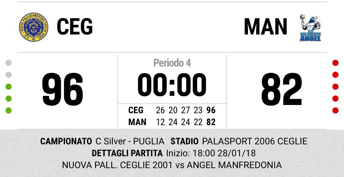 L’equilibrio regna anche nei successivi periodi (27-22 e 23-22), ma il vantaggio conseguito in apertura consegna in pratica il successo al Ceglie che può così proseguire il suo cammino solitario in vetta, mentre la Silac, penalizzata notevolmente dalla mancanza di rotazioni, merita un plauso particolare.
